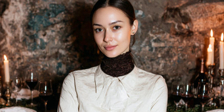 A woman poses in a restaurant setting with a stone wall. There are candles and wine glasses on a table behind her. It is an evening social event with soft lighting.