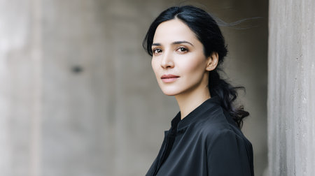 A woman is posing for a portrait, showcasing her natural beauty and confident demeanor. She wears a black blazer and gold accessories, exuding elegance and poise.