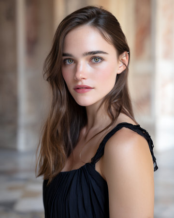 A young woman with striking green eyes and long brown hair gazes directly at the camera, her expression serene. She is wearing a black dress with delicate straps, and the soft lighting highlights her features, creating an intimate and elegant portrait.