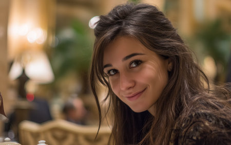 A young woman with long, dark hair smiles gently as she looks towards the camera. The background is softly blurred, suggesting an indoor setting like a restaurant or lounge, with warm lighting creating a cozy atmosphere.