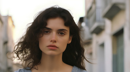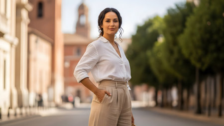 A beautiful woman with dark curly hair stands confidently on a sunny street with historic architecture in the background. She wears a white linen shirt and beige trousers, posing with one hand in her pocket.