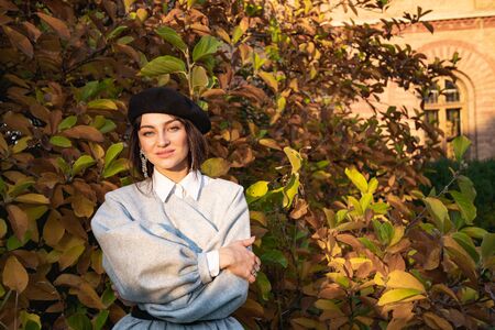 Attarctive young woman with natural makeup dressed in black beret and grey old-fashioned dress holds hands together and looking at the camera, stands near autumn bush