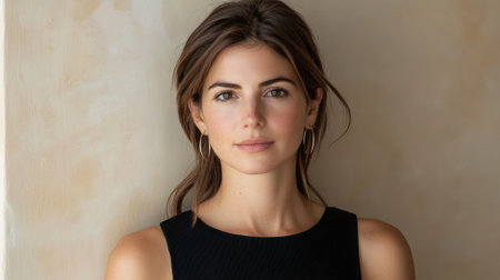 Young woman with hoop earrings and a black top stands against a neutral background, AI
