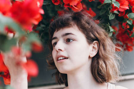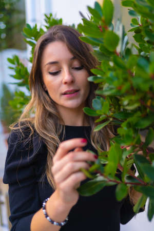 Portrait of a young blond Caucasian woman next to some green plants in spring