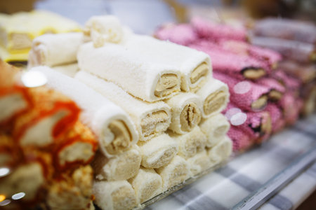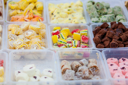 Wide range of Turkish delight (lokum) at the Grand Bazaar in Istanbul, Turkey. The historical market is a popular tourist destination and one of oldest markets in the world.
