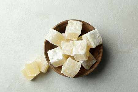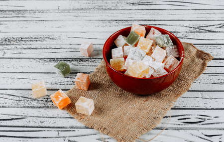 Some turkish delight lokums in a bowl on cloth and white wooden background, high angle view.
