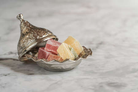 Turkish delight (lokum) in traditional oriental carved patterned metal plate. Top view with copy space