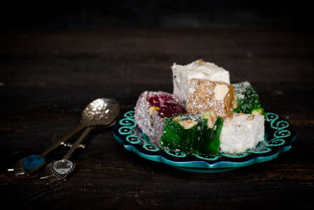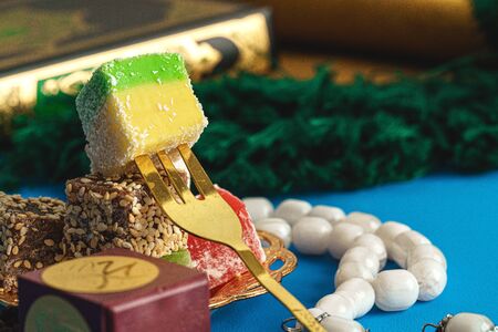 Assorted Turkish delights Rahat lokum. Colorful cubes of Turkish delights. Ramadan bayrami (eid al fitr) and Kurban bayrami (eid al adha) background photo.