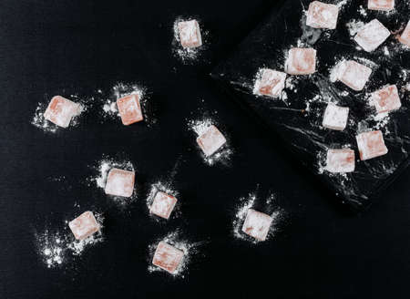 Turkish delight - rahat lokum or lokum with sugar powder on grey background. Traditional eastern cuisine. Traditional middle eastern sweets. Jewish, turkish, arabic national dessert. Turkish delight
