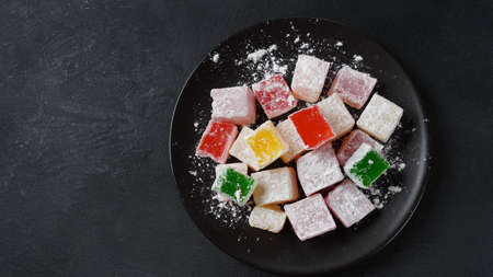 Top view turkish delight lokums in saucer on black textured background. horizontal space for text