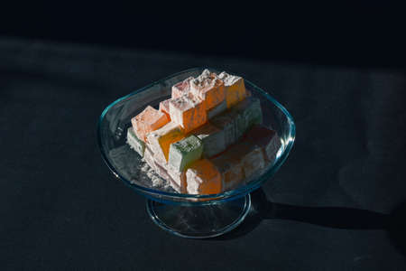 Turkish delights illuminated by sunlight on the glass bowl isolated on black background. Eid al-Fitr (eid al fitr) and Eid al-Adha (eid al adha) background photo. eid mubarak (happy holidays)