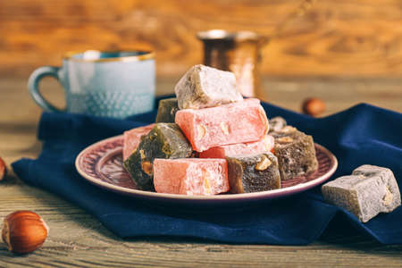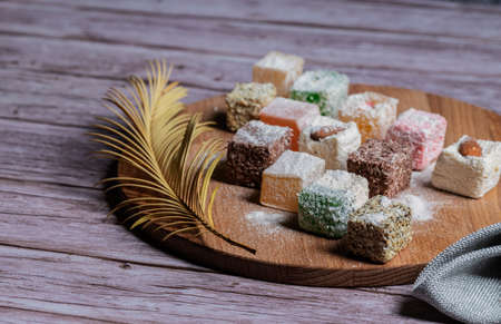 Assorted Turkish delight on wooden background. Close-up. Selective focus.