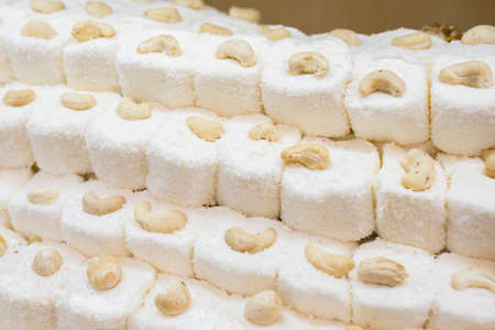 Turkish delight with nuts and coconut flakes. Traditional oriental sweets, natural products.