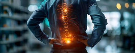 Person with lower back pain, capturing the discomfort and challenges faced by individuals experiencing lumbar discomfort, highlighting the need for attention and care in managing spinal health.