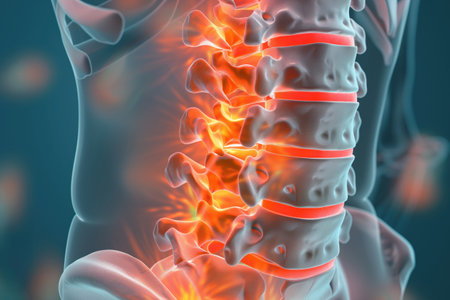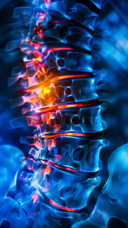 Detailed anatomy 3D illustration illustrating an inflamed lumbar spine with inflammation affecting vertebrae AI Generative