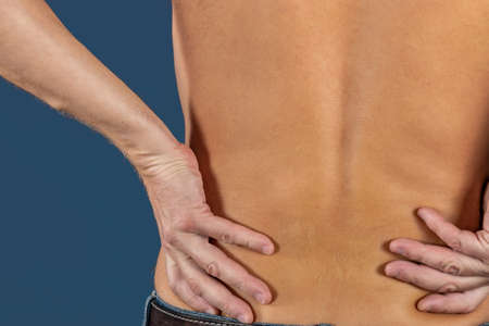 man touching his back, guy has disk peoblems in his back. close up cropped back view photo. isolated blue background