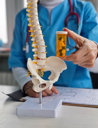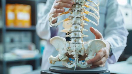 A doctor in a white coat holds a plastic model of a human spine, demonstrating the anatomy of the lower back and pelvis. The model is positioned on a black circular base in a medical office.