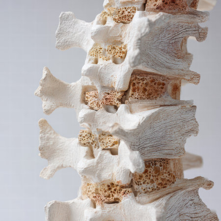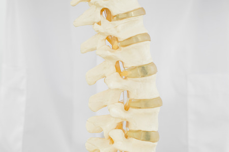 A detailed anatomical model showcases the human spine emphasizing the vertebraes structure and alignment. The model illuminated against a white background highlights the curvature and the distinct characteristics of each vertebra