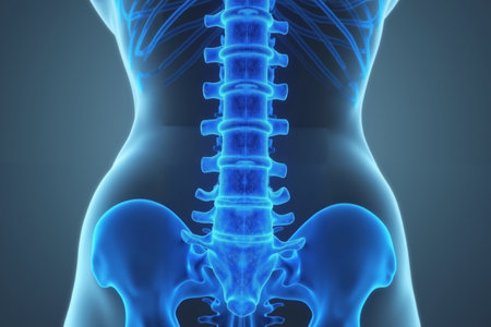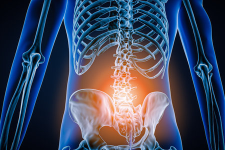 The stylized human spine and pelvis are rendered in warm light against a black background, allowing for a clear view of the anatomical structures.