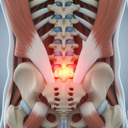 This image depicts a detailed anatomical illustration of the lumbar spine, highlighting degeneration at the L4-L5 vertebrae. The illustration shows the spine's vertebrae, intervertebral discs, and surrounding muscles. The area of degeneration is emphasized with a red glow, indicating potential pain or injury.