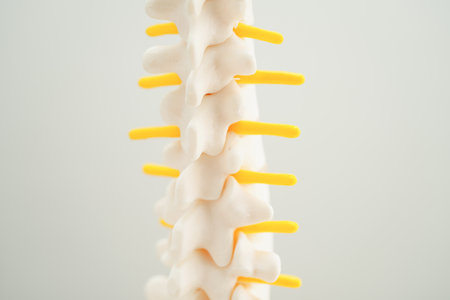 Detailed view of a human spine model, focusing on the vertebrae and alignment, medical concept