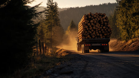 Truck loaded with logs travels along a winding road through a forest, illuminated by soft morning light, highlighting the connection between nature and logistics