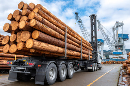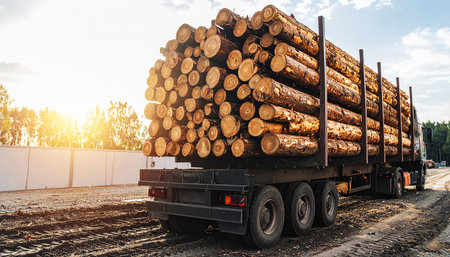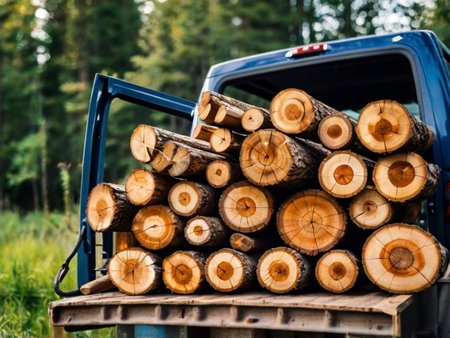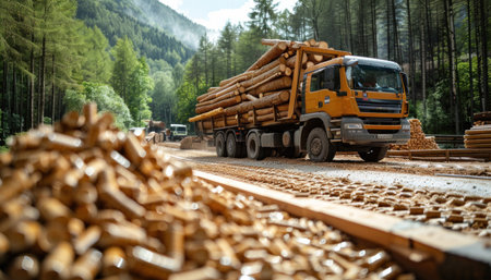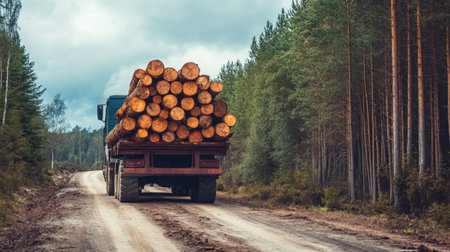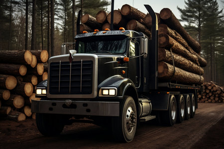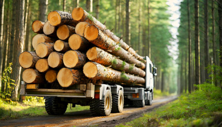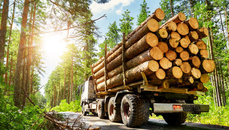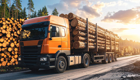 A vibrant image showcasing a heavy-duty cargo truck loaded with stacked logs, demonstrating operations in the logging industry amidst a serene forest backdrop.