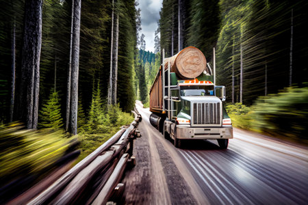 Log truck rushes down the mountain road. Truck Car in motion blur