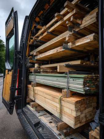 Logistics van displays an organized load of wood planks, with the upper area remaining free. This setup maximizes space for transporting materials.