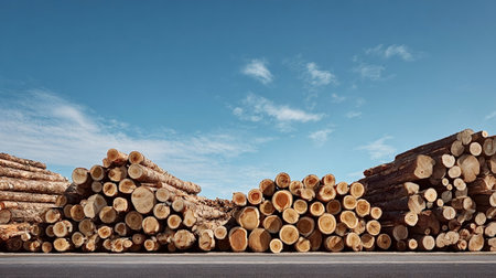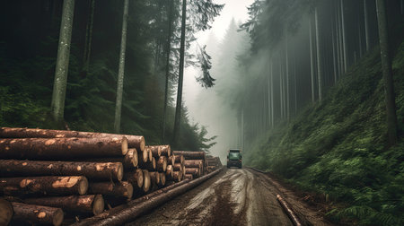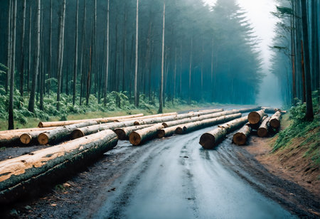 Trees chopped in forest. Felled timber. Wood storage for industry. Deforestation. Generative AI.