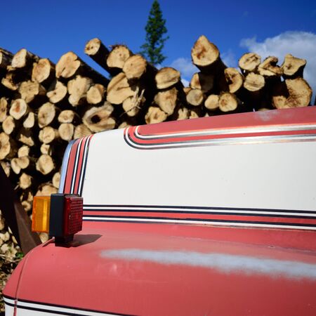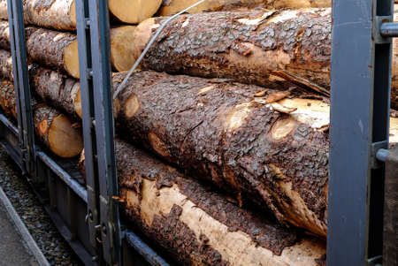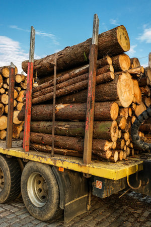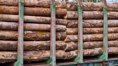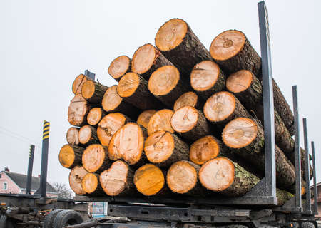 A trailer truck carrying wooden logs, Stack of wooden logs in big trailer vehicle.