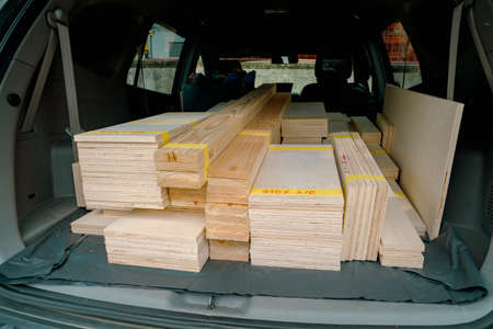 Wooden plywoods stacked and labeled with measurement inside the car.