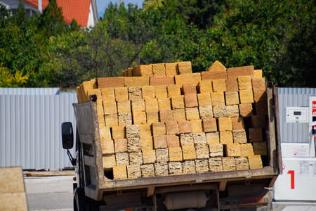 Taman, Russia - July 9, 2019: Transportation of blocks of limestone shell by the truck.