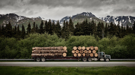 Logging truck with large timber logs driving on mountain road with pine forest and snow capped peaks in background, natural outdoor scene
