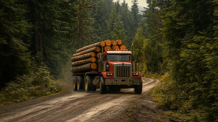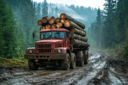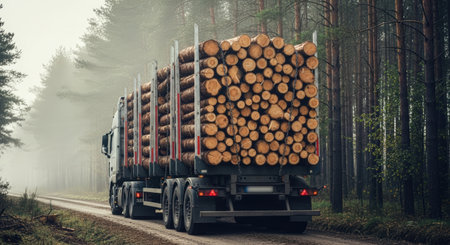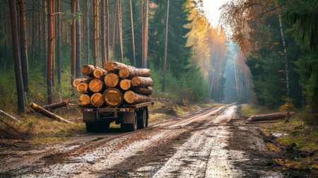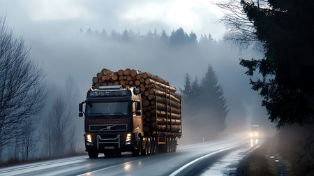 A rugged logging truck navigates a narrow forest road, carrying freshly cut timber through a misty, autumn landscape, embodying the spirit of rural transportation.
