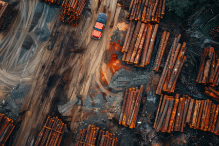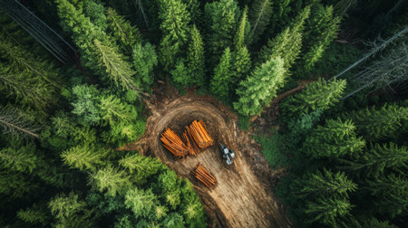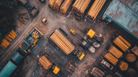 Aerial view of a timber logging site with logs neatly stacked and machinery in motion in a deforested area.. AI generated.