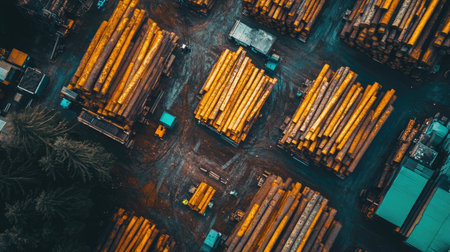 This aerial image captures a log yard with neatly stacked timber and heavy machinery, showcasing the industrial operations of the timber industry.