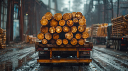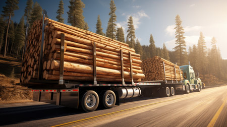 Semi Truck Wood Material Transportation. Timber on a Vehicle. Wood Production Industry Theme.