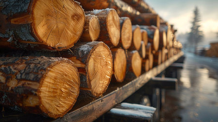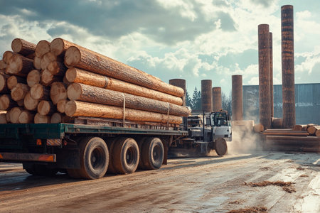 In a vibrant lumber yard, a truck navigates through towering stacks of freshly cut logs, with sunlight casting a warm glow from the horizon. Dust rises as machinery hums, showcasing a lively day.