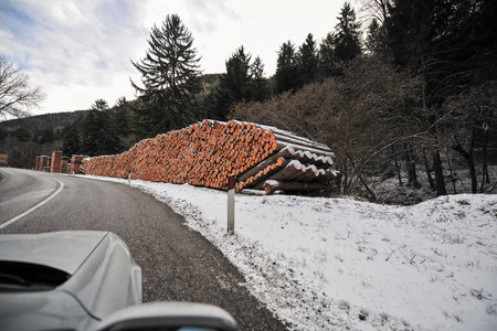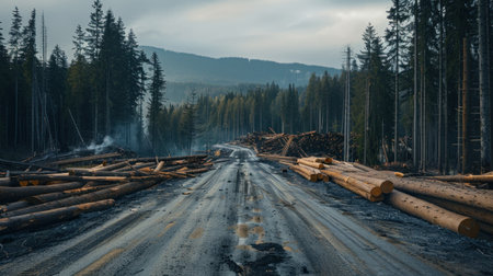 Forest road with stacked logs on both sides, nature trail adventure travel concept for outdoor enthusiasts