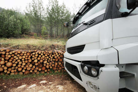 Trucking Logs on the road in the forest. Concept of ecological transport.