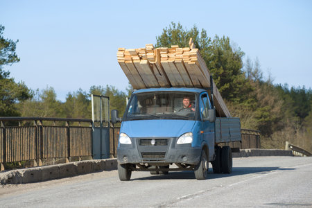 Freight truck loaded with birch logs drives along a summer rural road in Siberia, Russia. Transportation of felled forest. Preparation of firewood for the winter