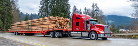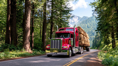 Red Semi-Truck Transporting a Large Load of Lumber on a Scenic Highway, Surrounded by Lush Forests