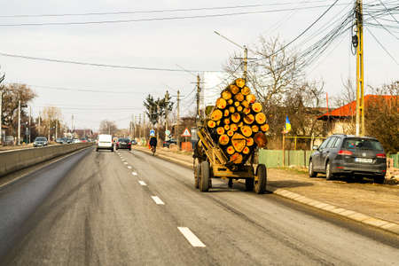Carriage carrying wooden logs on the street in Targoviste, Romania, 2021