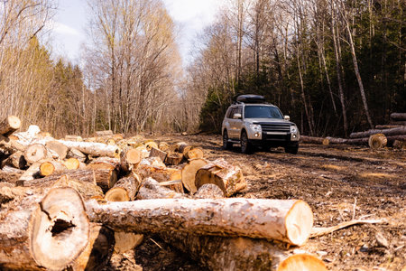 SUV on scenic autumn road in the forest near a log warehouse at the logging site