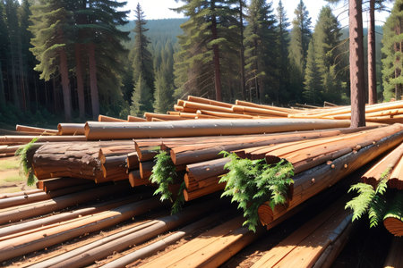 Pile of lumber in pine forest concept