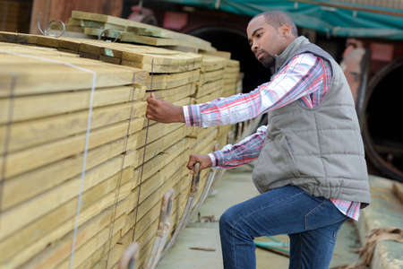 Male Worker folds boards. Sawmill. wood harvesting process.