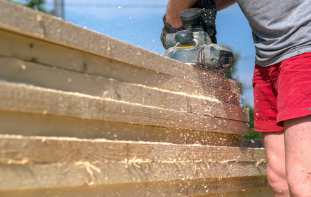 man planning boards with electric tools, chips flying in all directions. Construction, wood processing
