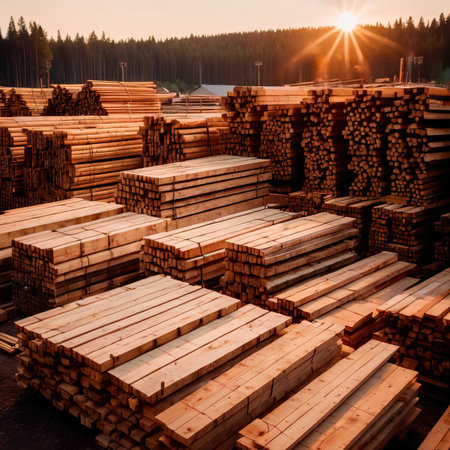 Golden Hour Glow on Stack of Lumber Construction, Building, and Natural Material Industry