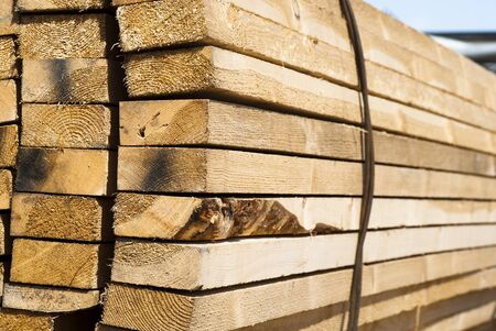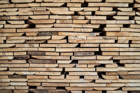 Close up on stack of rough sawn timber pine lumber planks construction material